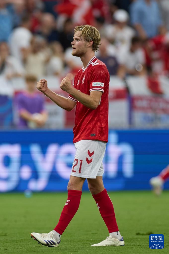 6月20日,丹麦队球员摩顿·尤尔曼在比赛中庆祝进球。新华社记者 孟鼎博 摄