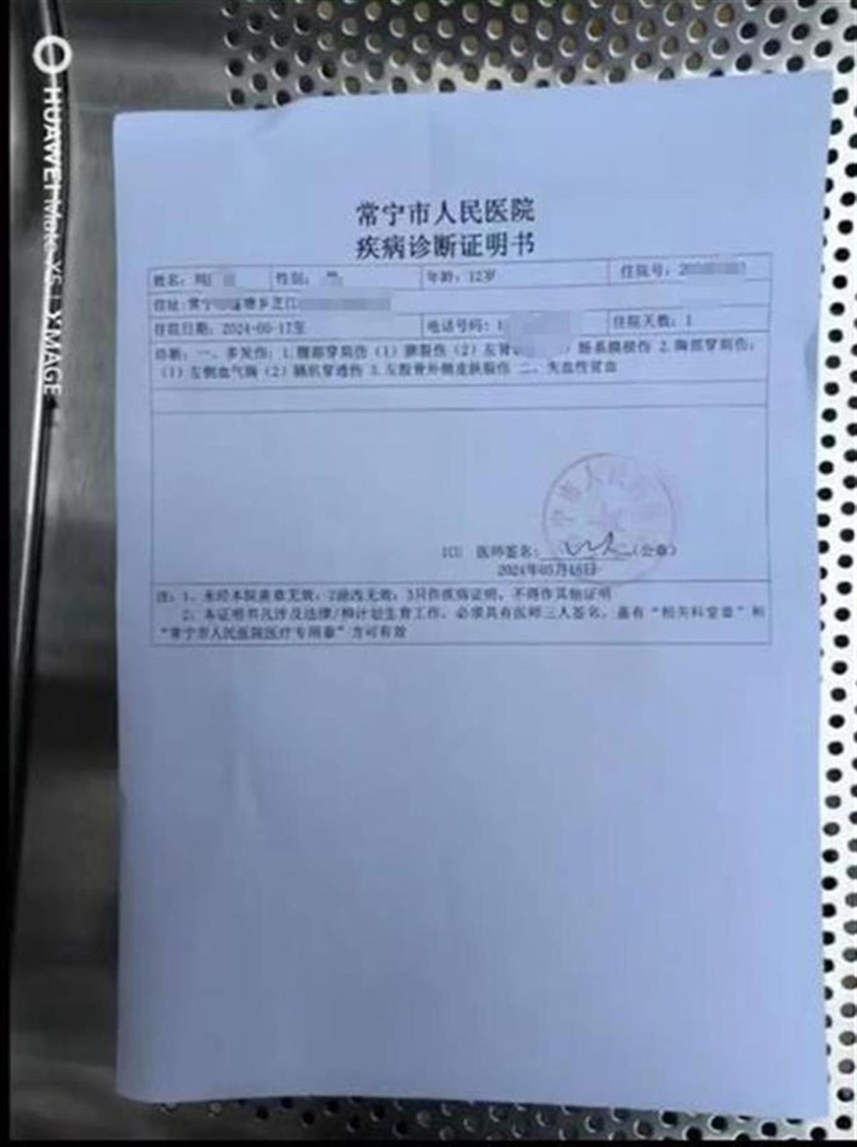 网友发布了被刺伤的孩子在医院接受治疗的照片,以及医院诊断证明书。据该网友发布的视频反映,其亲属的儿子于5月17日在上晚自习时,被一名同班同学用刀连续刺伤,先是被送到当地一所医院治疗,后被其父亲带到长沙治疗。面对儿子高昂的医疗费,加上家中老人身体不好,压力重重的孩子父亲跳入湘江,至今仍失踪。当事人的女性家属称,6月19日晚6时50分许,孩子父亲在长沙某景点附近跳入湘江,现在还没有找到。