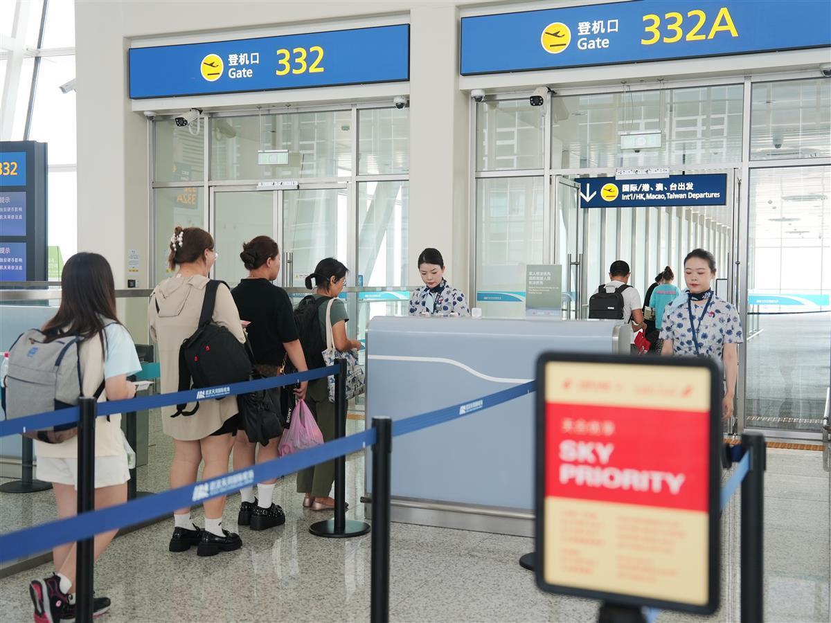 早上7时,在东航值机柜台,前往新加坡的旅客在工作人员的引导下有序办理值机手续,现场还设置了打卡点,供旅客拍摄留念。“这个航班时间特别好,以后去新加坡看儿子更轻松便捷了!”旅客王女士说。