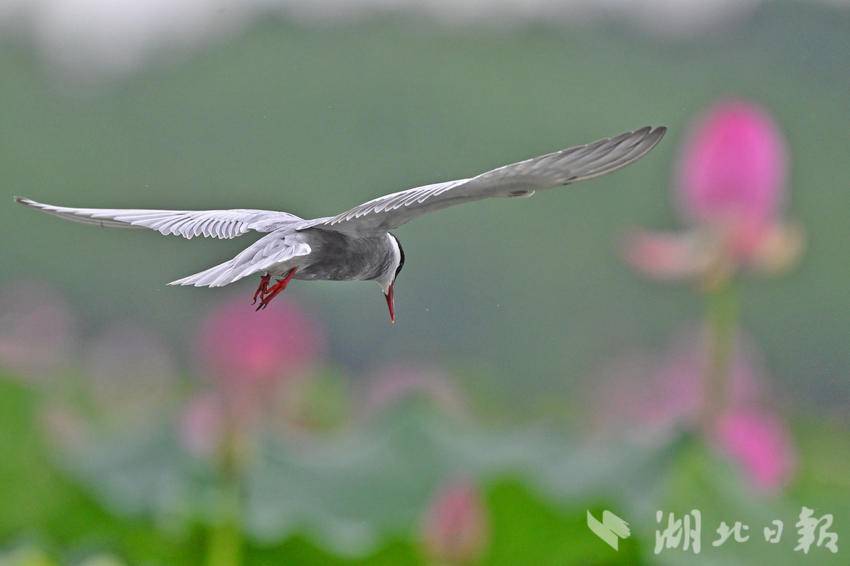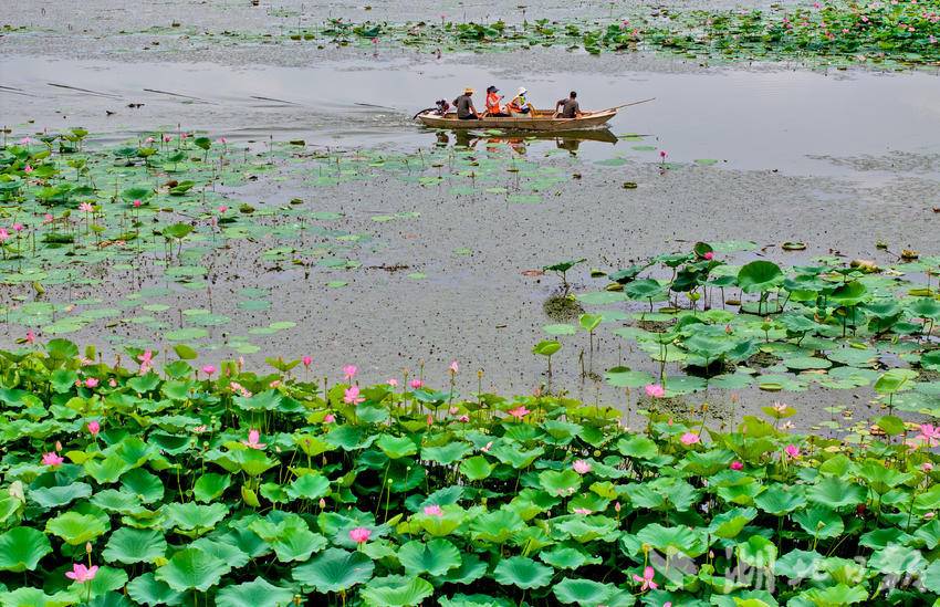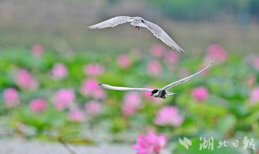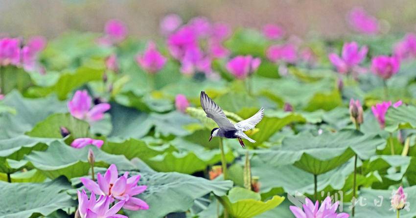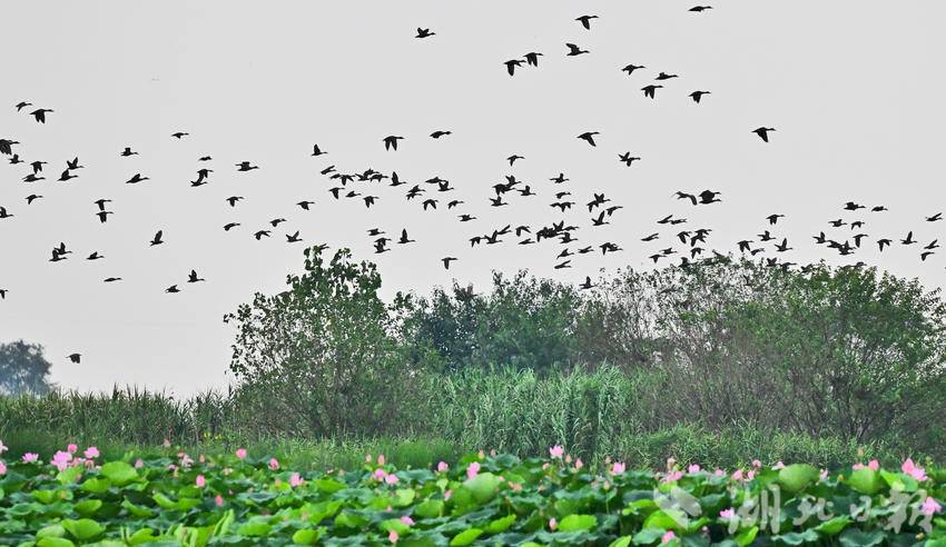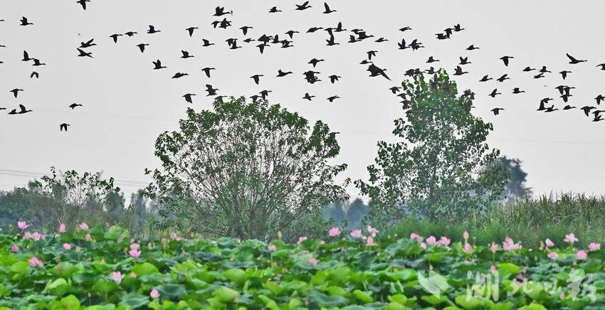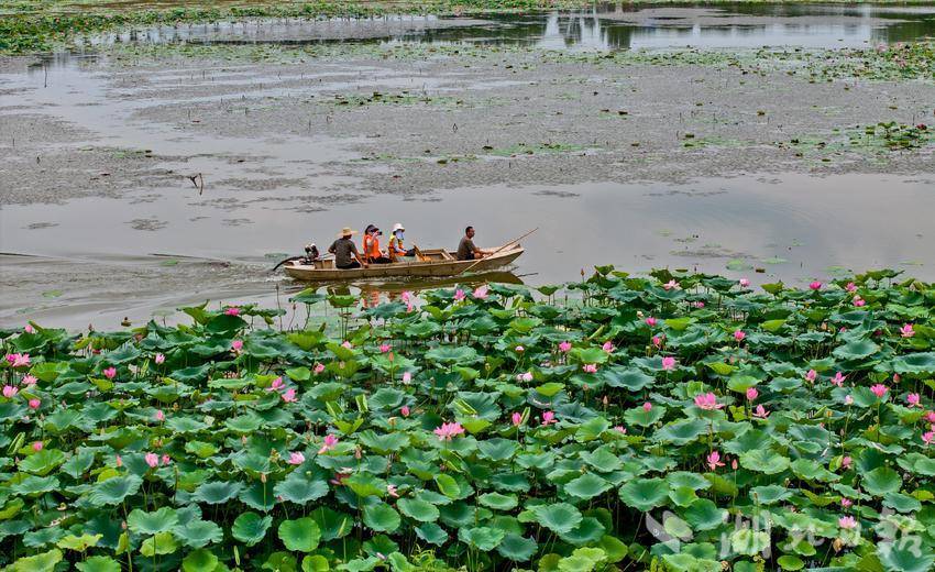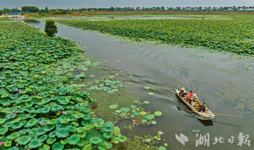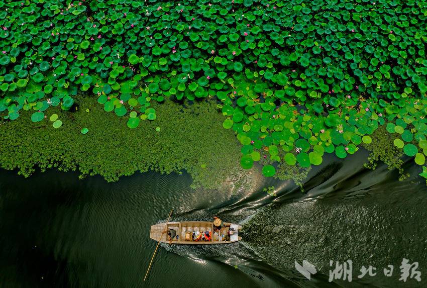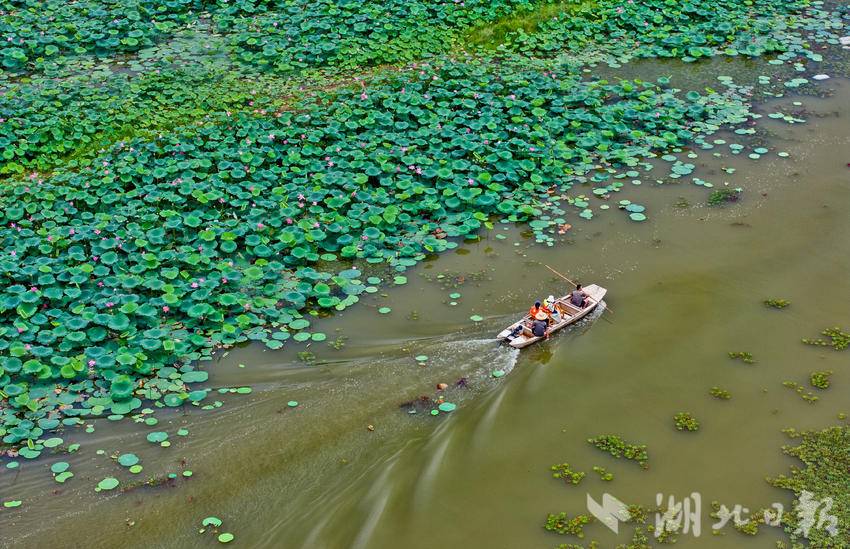 6月19日,荆州市荆州区菱角湖国家湿地公园内,荷花盛开连片的野生菱角生长旺盛,湖面上百鸟翔集,湖区生态保护志愿者驾驶冲锋舟,在湖面巡逻。