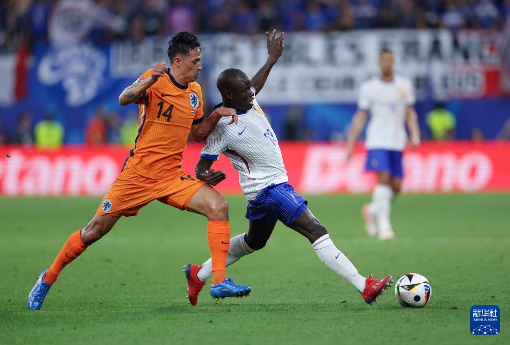 6月21日,法国队球员坎特(右)与荷兰队球员赖因德斯拼抢。新华社记者 白雪飞 摄
