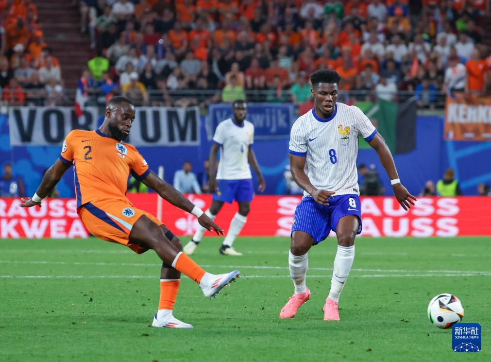 6月21日,法国队球员楚阿梅尼(右)与荷兰队球员海特勒伊达在比赛中拼抢。新华社记者 张帆 摄