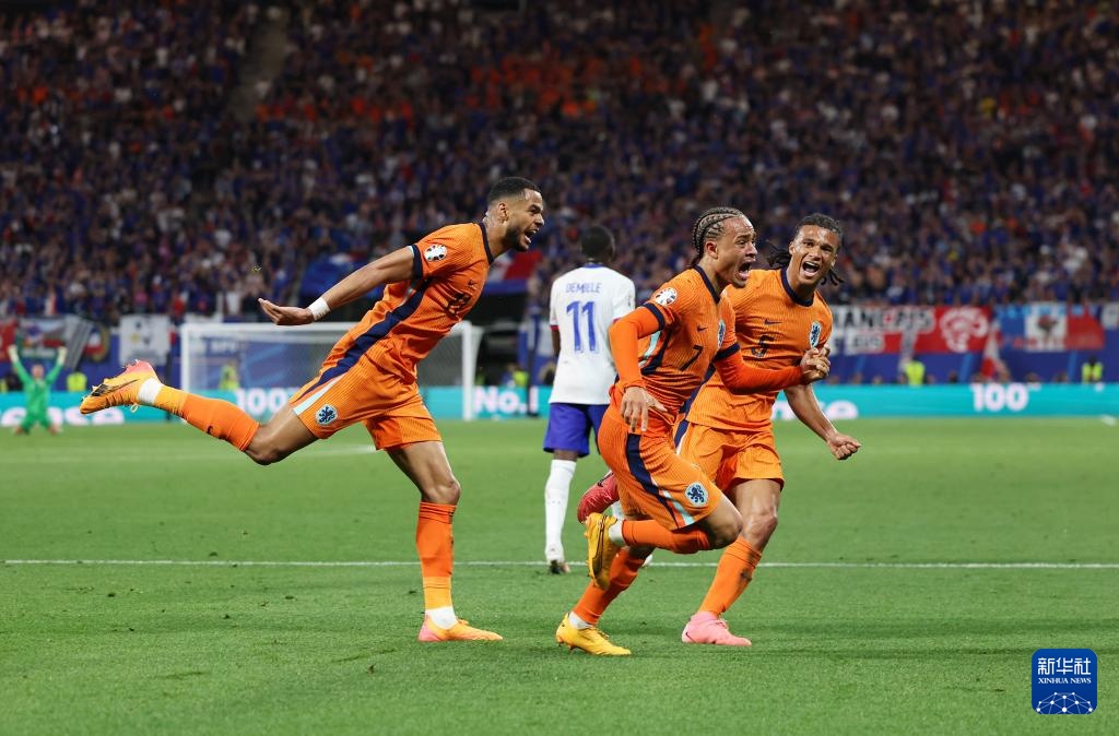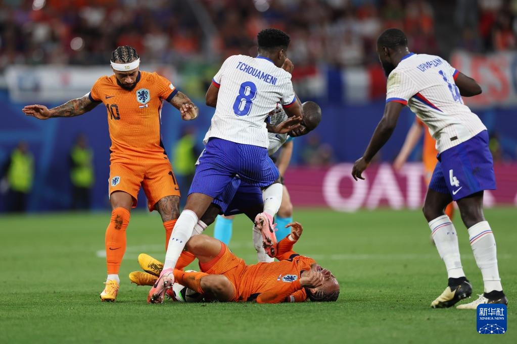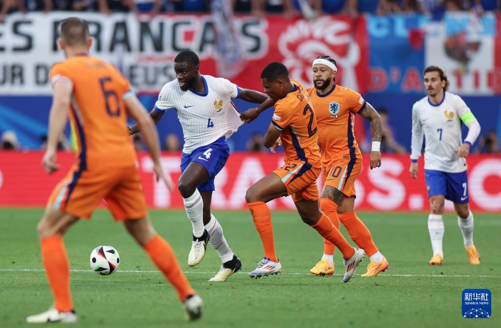 6月21日,荷兰队球员邓弗里斯(左三)与法国队球员于帕梅卡诺(左二)拼抢。新华社记者 白雪飞 摄