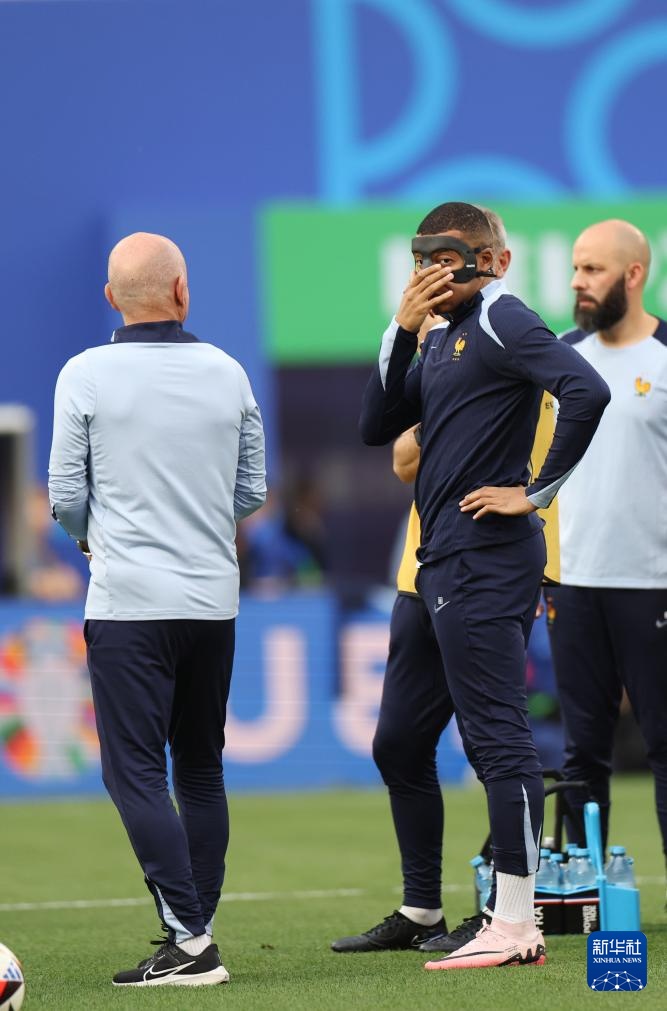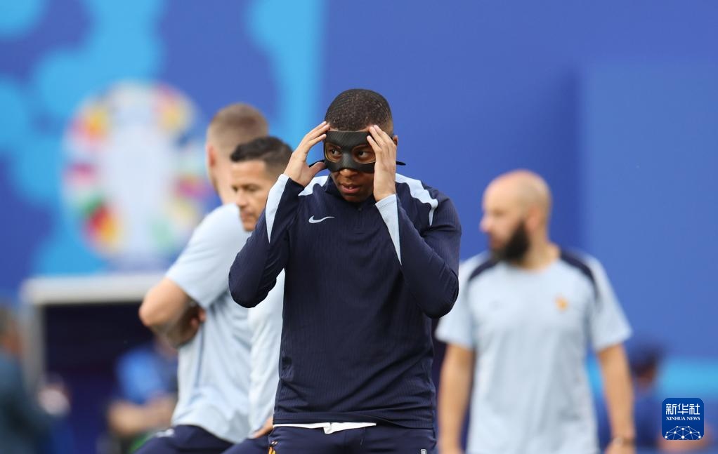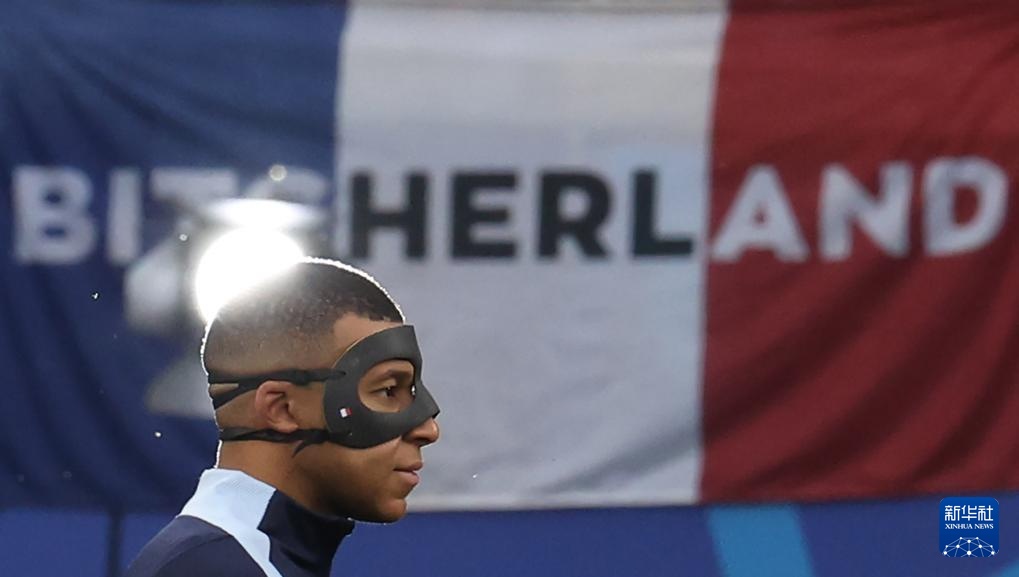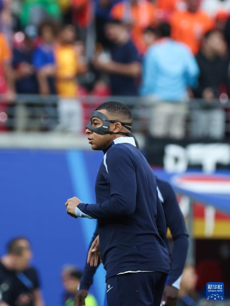 6月21日,法国队球员姆巴佩赛前热身时佩戴面具,他本场比赛因伤未能上场。新华社记者 白雪飞 摄