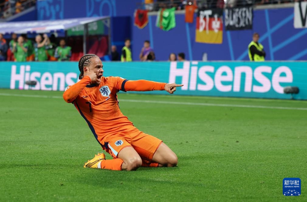 6月21日,荷兰队球员西蒙斯庆祝进球,随后该进球被判无效。新华社记者 白雪飞 摄