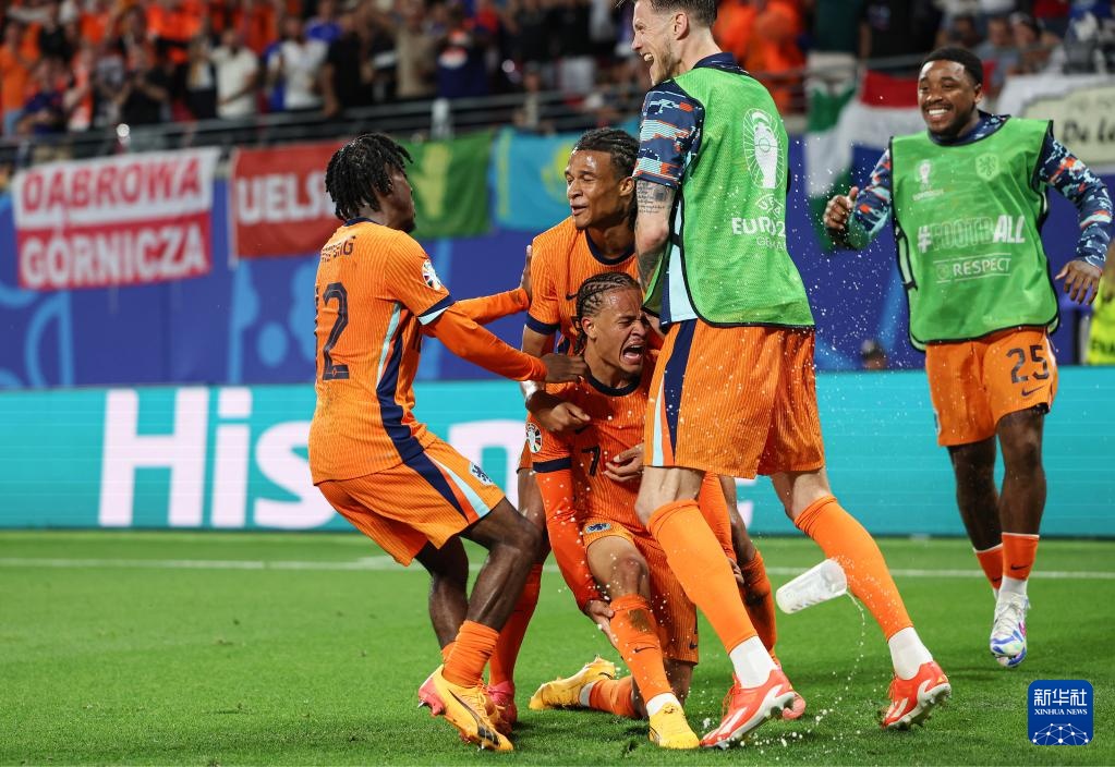 6月21日,荷兰队球员西蒙斯(下)与队友庆祝进球,但进球随后被判无效。新华社记者 白雪飞 摄