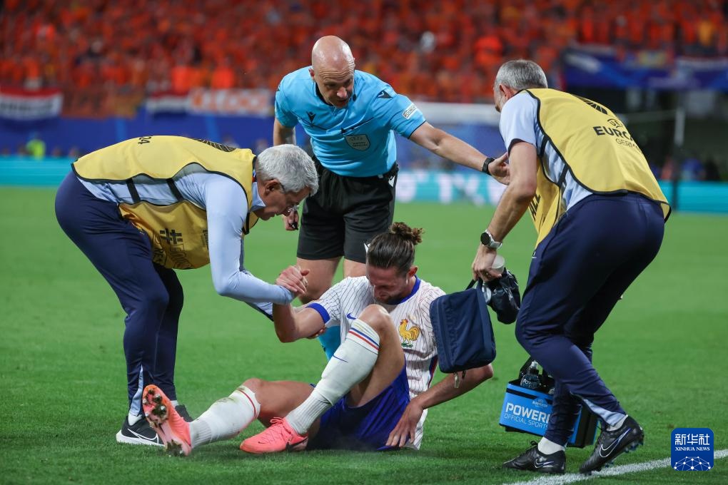 6月21日,法国队球员拉比奥(中)受伤后接受治疗。新华社记者 张帆 摄