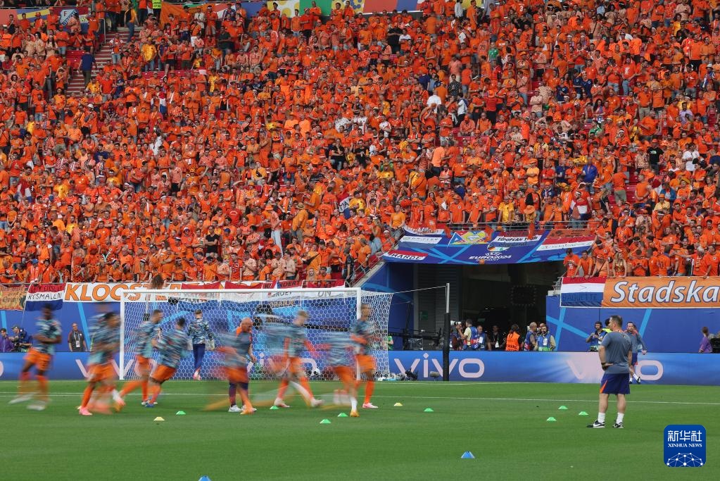 6月21日,荷兰队球迷观看球员热身。新华社记者 白雪飞 摄