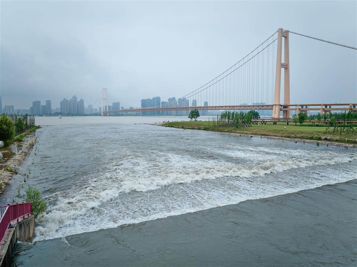 连日强降雨后,长江武汉段水位正在上涨。据长江水文网6月22日16时发布的数据,长江汉口段水位已达23.10米。记者在武汉杨泗港大桥南岸看到,江南泵站排水泵机组运转,带动滚滚水流汇入长江。