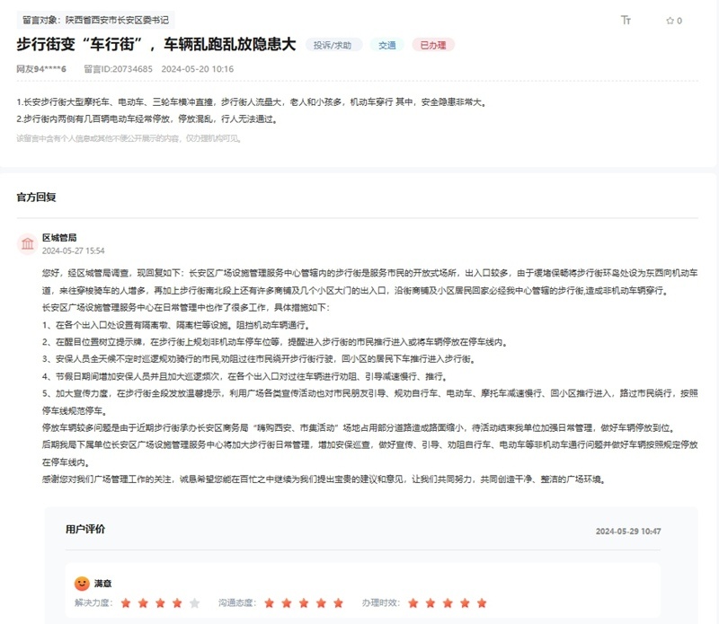 收到留言后,长安区城管局立即展开调查并作出回复,步行街是服务市民的开放式场所,出入口较多,由于缓堵保畅将步行街环岛处设为东西向机动车道,来往穿梭骑车的人增多,再加上步行街南北段上还有许多商铺及几个小区大门的出入口,沿街商铺及小区居民回家必经步行街,造成非机动车辆穿行。