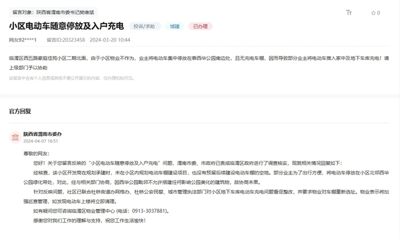 收到留言后,渭南市委、市政府立即责成临渭区政府进行调查核实。经核查,该小区开发商在规划承建时,未在小区内规划电动车棚建设项目,也没有预留后续建设电动车棚的空地。部分业主为了出行方便,将电动车停放在小区北邻西华公园绿化带处。对此,经与相关部门协商,因西华公园毗邻不允许搭建任何影响公园美化的建筑物,故协商未果。