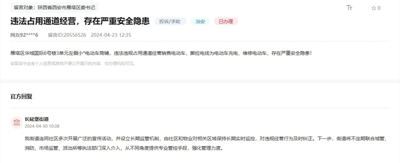 雁塔区长延堡街道在回复中表示:街道连同社区多次开展广泛的宣传活动,并设立长期监管机制,由社区和物业对相关区域保持长期实时监控,对违规经营行为及时纠正。下一步,街道将不定期联合城管、消防、市场监管、派出所等执法部门深入介入,从不同角度提供专业管控手段,强化管理力度。