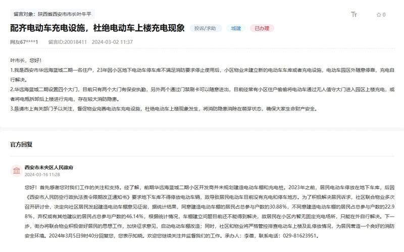 西安市未央区人民政府在回复中表示,“下一步,街道办将联合物业积极做好居民的思想工作,加快征求意见,启动电动车棚改造;同时,社区和物业将严格管控排查电动车上楼及乱停放情况,为居民营造一个良好的消防安全环境。”