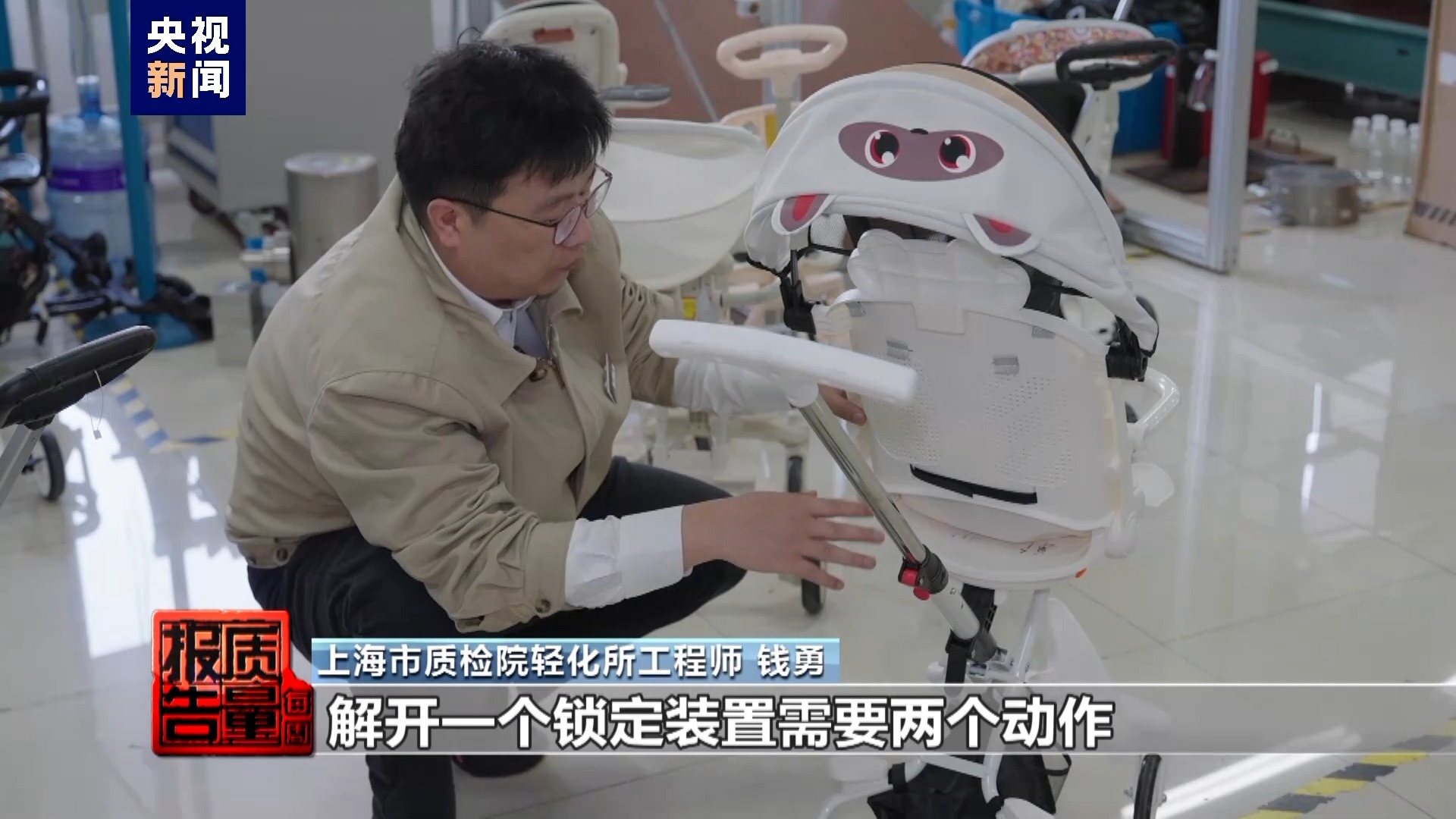 上海海关机电产品检测技术中心轻工消费品科高级工程师 倪彬彬:如果锁止装置失效,推车在推行过程中遇到障碍物就会直接倾倒,里面的小孩可能会跌出车造成摔伤。