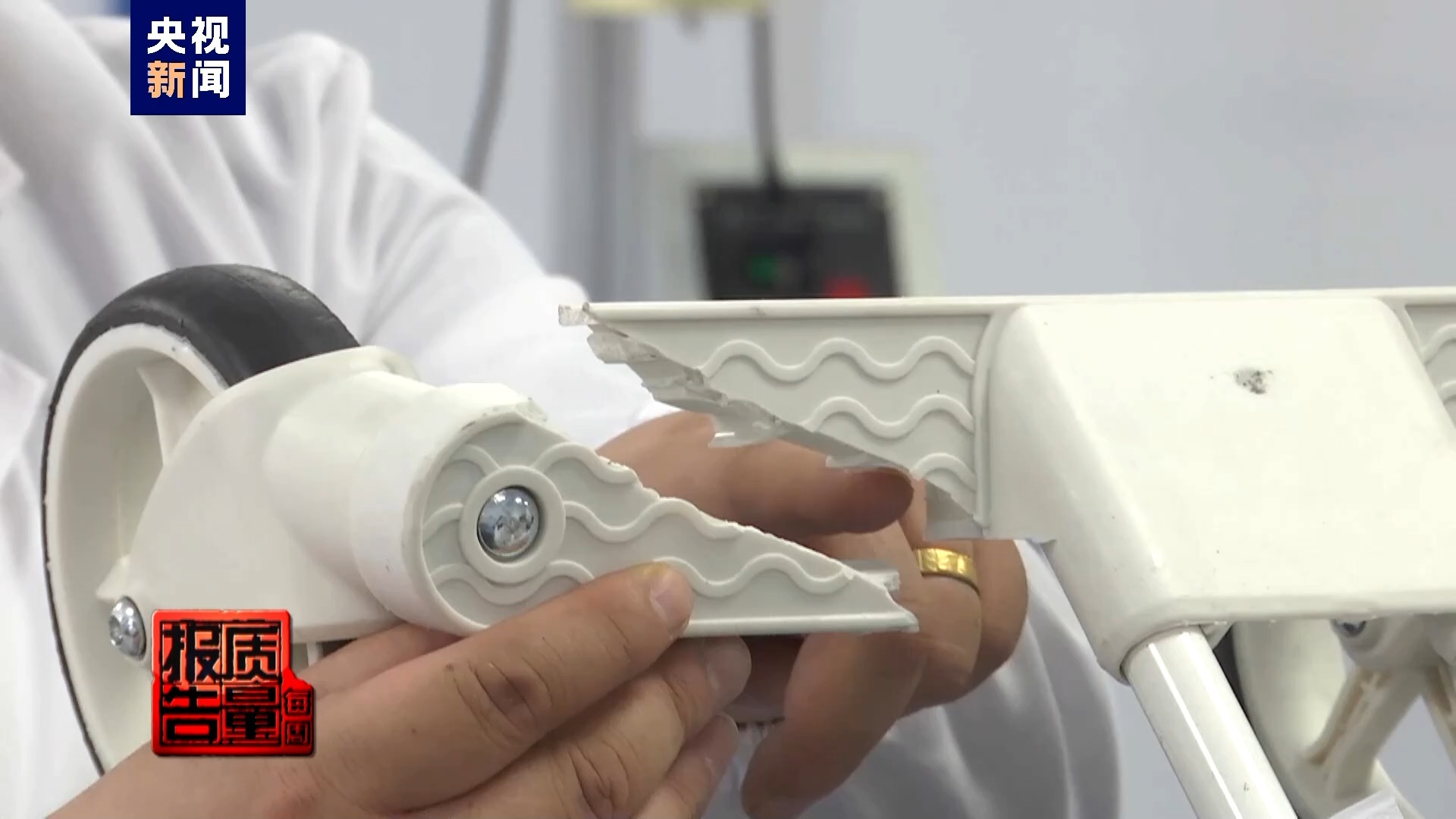 中国玩具和婴童用品协会标准法规部副经理 殷志杰:经过检测后,这个塑料部件发生断裂,这种情况我们初步判断它是加了比较多的碳酸钙,那么它的成本是能低10%到20%左右,这样的话企业能省不少钱。断裂的金属件,用的是相对壁厚比较薄的一个黑皮管的材料,会比底壁厚厚的黑皮管,以及质量比较好的白皮管,价格便宜30%到40%。