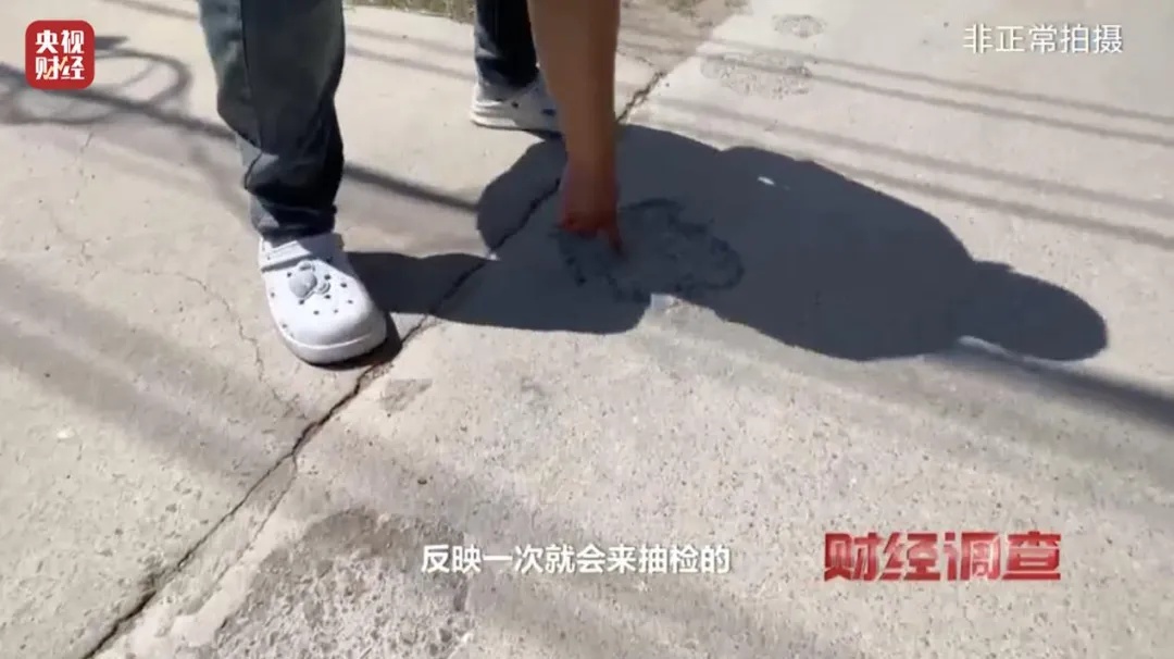 在刘家社区主干道的十字路口处,记者还发现了一处奇怪的区域,水泥地面上每隔一米便会出现大小不一的圆形破损,沿道路至少有十几处。村民们告诉记者,这就是刘家社区应付上级检查和工程质量检测使用的专用地块。只要村民向上反映问题,就会专门领到这里来抽检,原因很简单,因为只有这里的水泥质量和厚度是达标的。