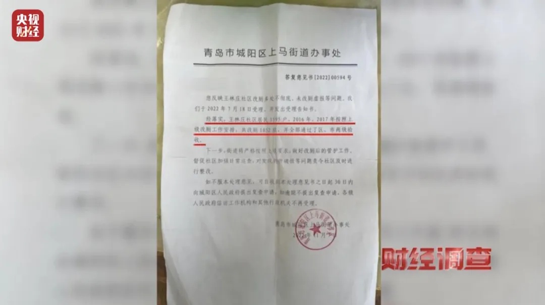 针对厕所改造存在的问题,王林庄村的居民也曾多次向相关部门反映,但得到官方答复却是:“经落实,王林庄社区居民1595户,2016年、2017年按照上级改厕工作安排,共改厕1052座,并全部通过了区、市两级验收。”