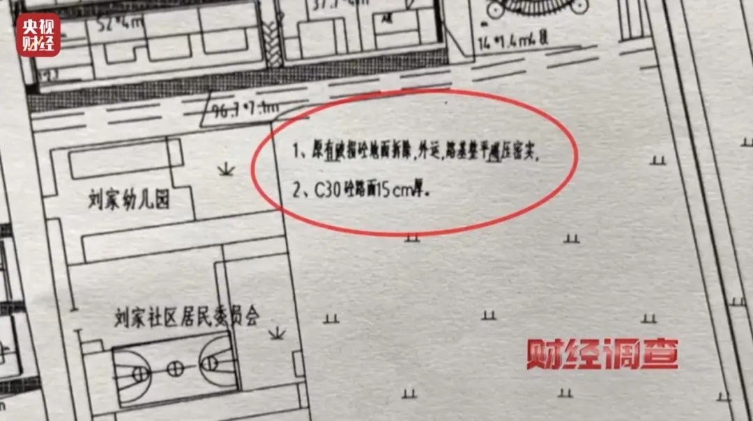 2019年刘家社区美丽乡村规划总平面图“路面竣工图”显示,施工标准为“C30标号砼(水泥)路面15厘米厚”,但实际路面只有2厘米左右。