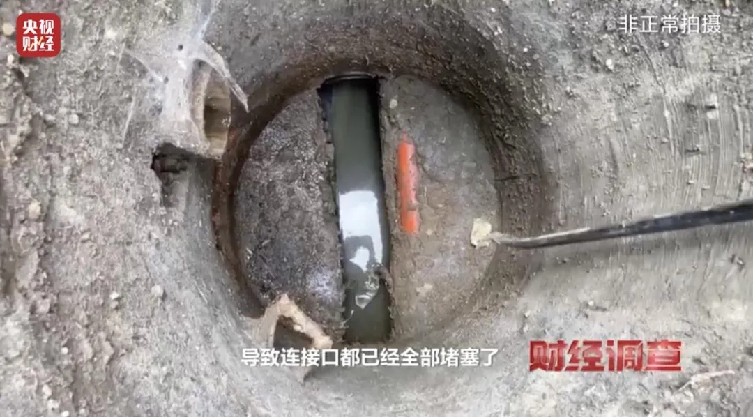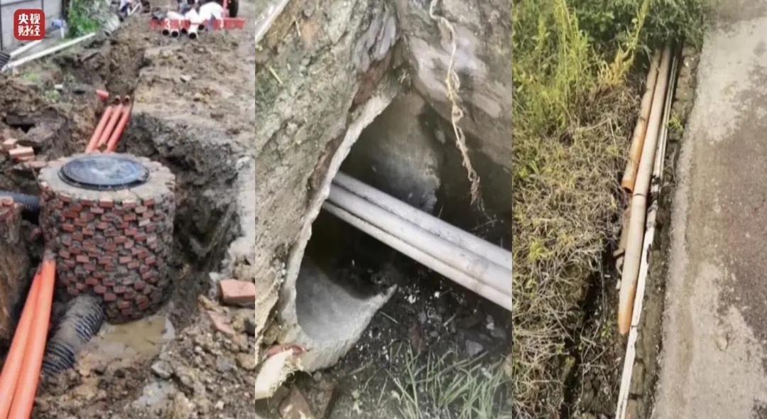 在村民的帮助下,记者打开一处污水井,拨开泥土,能看见红色强线缆与污水管赫然并排摆放在一起。按照施工规范,强弱电管和污水管必须保持相应的距离,因为一旦污水管线出现泄漏、损毁,紧挨着的强弱电管线将带来难以估量的危险。