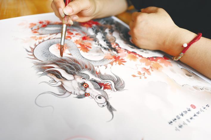 5月29日,湖北日报全媒记者走进紫云轩看到,工作台上摆放着一幅画稿,上面是一条栩栩如生的中国龙。只见师傅用镊子轻轻夹起一根梳理好的胎发,精准地粘贴到龙身上。