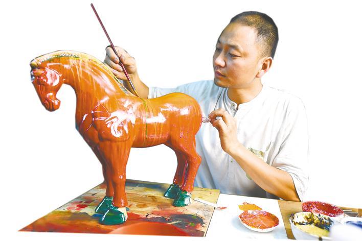 6月17日,襄阳传统漆器博物馆隗鹏用漆工艺制作新唐马。 (湖北日报全媒记者 田悦 通讯员 谢勇 摄)