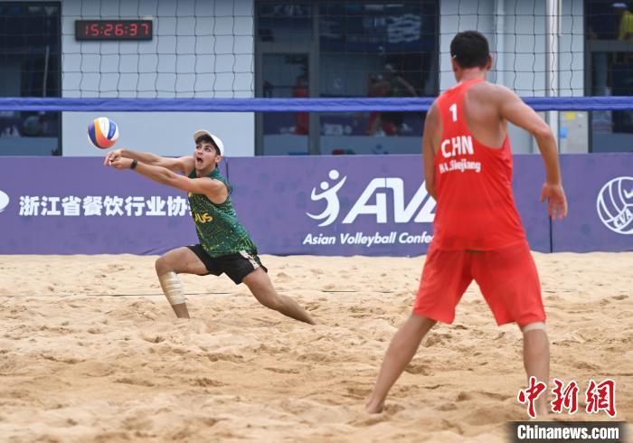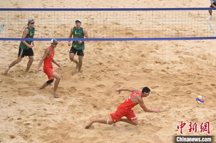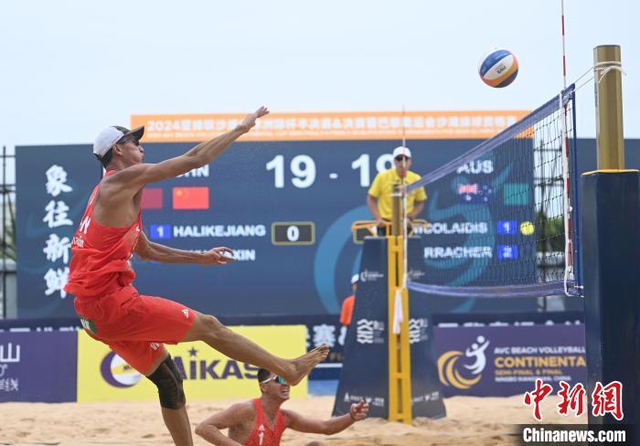 6月23日,2024亚排联沙滩排球洲际杯半决赛&决赛暨巴黎奥运会沙滩排球资格赛总决赛在浙江宁波象山举行,中国男队以1比2的大比分不敌澳大利亚男队,无缘2024巴黎奥运会。图为中国选手哈力克江(红衣,右)在比赛中。中新社记者 王刚 摄