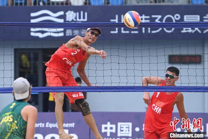 6月23日,2024亚排联沙滩排球洲际杯半决赛&决赛暨巴黎奥运会沙滩排球资格赛总决赛在浙江宁波象山举行,中国男队以1比2的大比分不敌澳大利亚男队,无缘2024巴黎奥运会。图为中国选手吴佳欣(红衣,左)在比赛中。中新社记者 王刚 摄