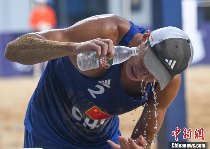 6月23日,2024亚排联沙滩排球洲际杯半决赛&决赛暨巴黎奥运会沙滩排球资格赛总决赛在浙江宁波象山举行,中国男队以1比2的大比分不敌澳大利亚男队,无缘2024巴黎奥运会。图为中国选手吴佳欣在比赛间隙冲洗眼部。中新社记者 王刚 摄