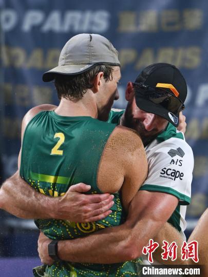 6月23日,2024亚排联沙滩排球洲际杯半决赛&决赛暨巴黎奥运会沙滩排球资格赛总决赛在浙江宁波象山举行,澳大利亚男队以2比1的大比分战胜中国男队,直通2024巴黎奥运会。图为澳大利亚选手Carracher(左)和队友拥抱庆祝。中新社记者 王刚 摄