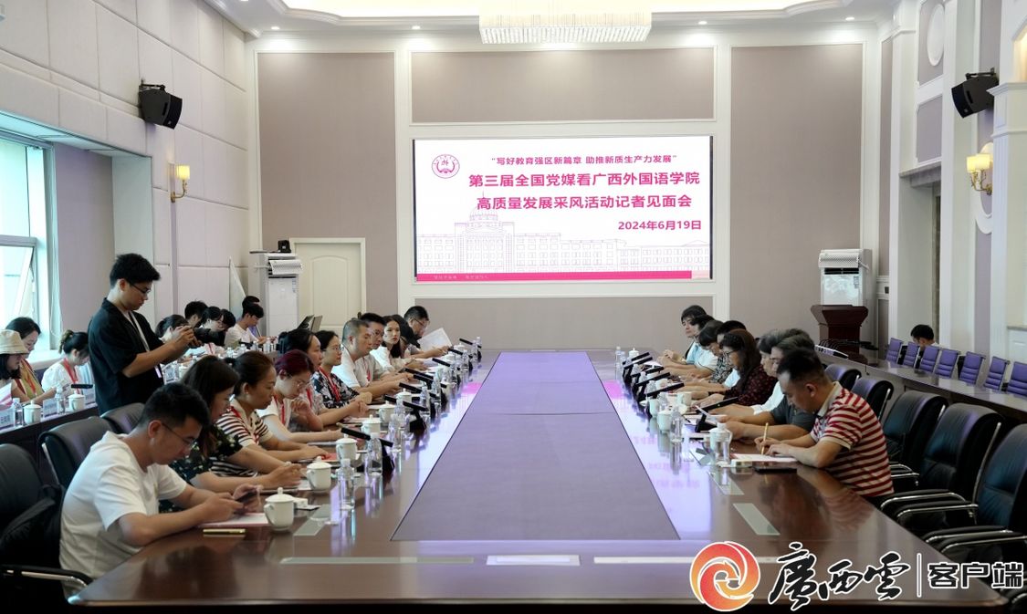6月19日下午,“写好教育强区新篇章 助推新质生产力发展”第三届全国党媒看广西外国语学院高质量发展采风团一行走进广西外国语学院,了解该校今年招生情况及政策,并参观该校在思政课程育人实践、跨境电商人才培养、国际化提升工程项目、多语种外语优势学科等方面的特色办学成果,实地感受该校面向东盟的国际化办学特色。