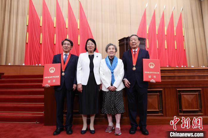 6月24日,全国科技大会、国家科学技术奖励大会和中国科学院第二十一次院士大会、中国工程院第十七次院士大会在人民大会堂隆重召开。李德仁院士、薛其坤院士获得2023年度国家最高科学技术奖。图为李德仁夫妇(右一、右二)、薛其坤夫妇合影。 记者 盛佳鹏 摄
