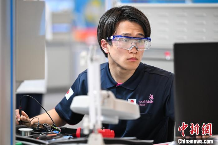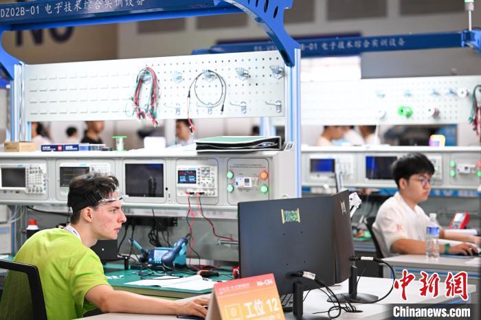 6月25日,第二届“一带一路”国际技能大赛在重庆国际博览中心举行,吸引来自61个国家和地区的590名技能精英参赛观摩。其中,参赛选手190名、裁判183名、翻译30名,部分国家还派出部长级官员和技术观察员全程观摩大赛。图为选手在电子技术项目比赛中。中新社记者 何蓬磊 摄