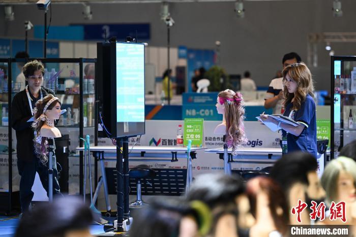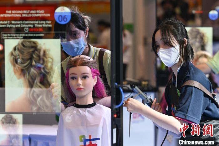 6月25日,第二届“一带一路”国际技能大赛在重庆国际博览中心举行,吸引来自61个国家和地区的590名技能精英参赛观摩。其中,参赛选手190名、裁判183名、翻译30名,部分国家还派出部长级官员和技术观察员全程观摩大赛。图为选手在美发项目比赛中。中新社记者 何蓬磊 摄