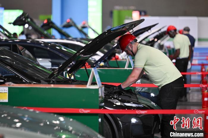 6月25日,第二届“一带一路”国际技能大赛在重庆国际博览中心举行,吸引来自61个国家和地区的590名技能精英参赛观摩,其中,参赛选手190名、裁判183名、翻译30名,部分国家还派出部长级官员和技术观察员全程观摩大赛。图为选手在汽车技术(新能源)项目比赛中。中新社记者 何蓬磊 摄