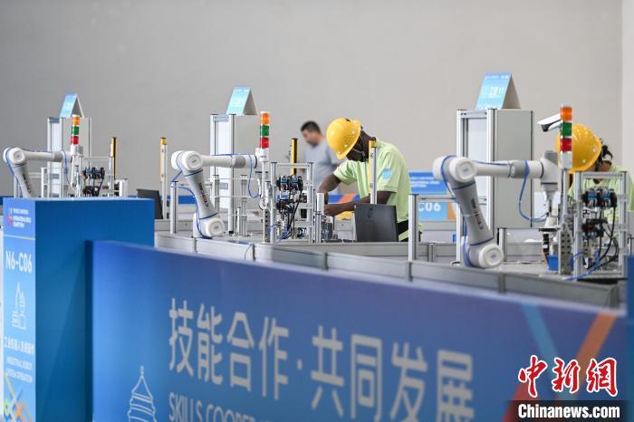 6月25日,第二届“一带一路”国际技能大赛在重庆国际博览中心举行,吸引来自61个国家和地区的590名技能精英参赛观摩,其中,参赛选手190名、裁判183名、翻译30名,部分国家还派出部长级官员和技术观察员全程观摩大赛。图为选手在工业机器人系统操作项目比赛中。中新社记者 何蓬磊 摄
