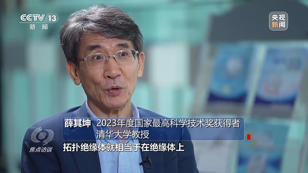2023年度国家最高科技奖获得者、清华大学教授 薛其坤:大家都知道,材料分为导电的金属导体,还有不导电的绝缘体,拓扑绝缘体相当于在绝缘体上镀了一层导体的金属膜,介于两者之间。量子反常霍尔效应就是在具有磁性的拓扑绝缘体全新材料中,出现全新的科学效应。