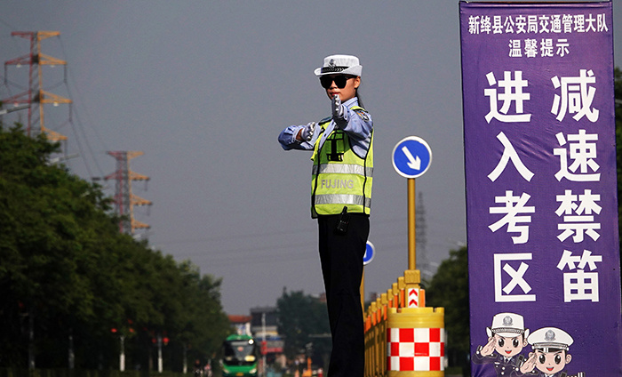 近日,山西省运城市新绛县公安局交警大队古城中队一名辅警在新绛中学考点外指挥车辆有序通过。本报通讯员 高新生 摄