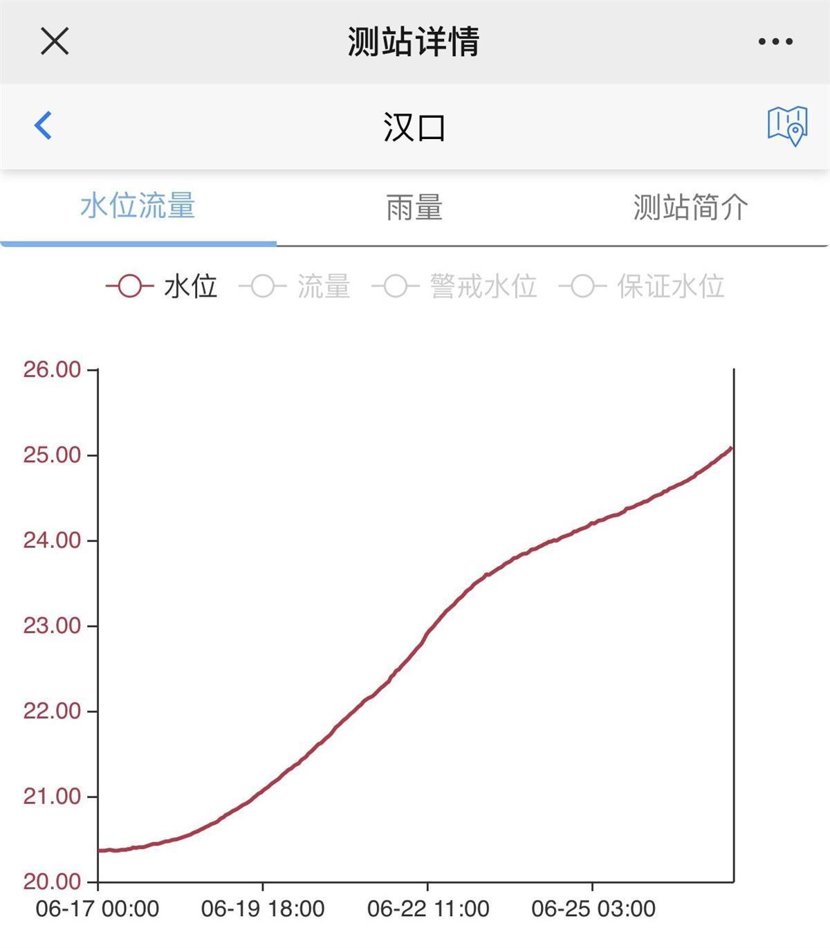 水文数据显示:27日7时,长江汉口站水位25.03米,突破设防水位;8时,25.05米;9时,25.09米。目前仍在缓慢上涨,这也是自2021年后,汉口站水位近三年来首次越过25米。