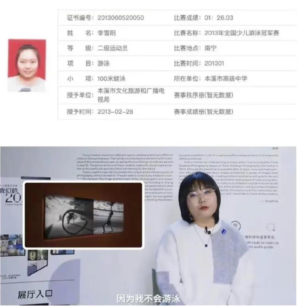 李雪琴(原名李雪阳)的二级运动员证及她接受采访的截图