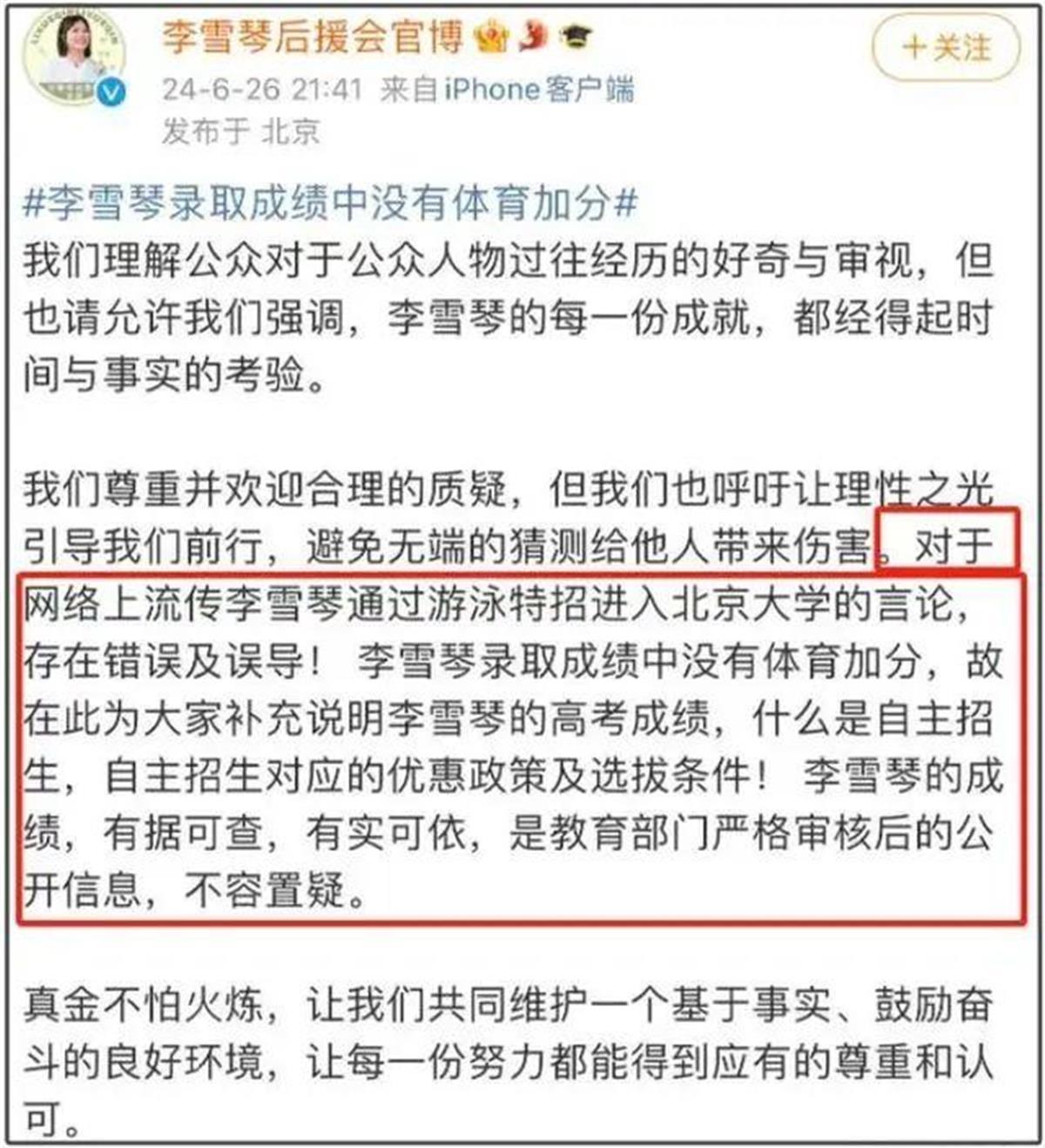 6月26日晚,@李雪琴后援会官博也发文强调李雪琴录取成绩中没有体育加分,“李雪琴的成绩,有据可查,有实可依,是教育部门严格审核后的公开信息,不容置疑。”(据6月27日新黄河)