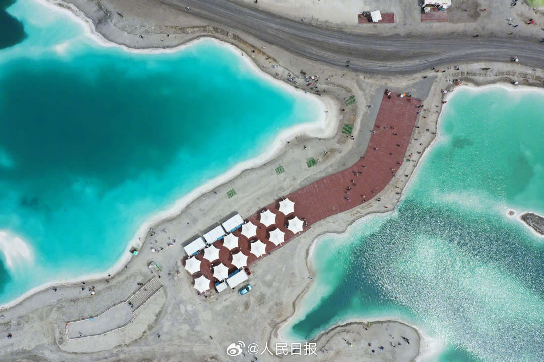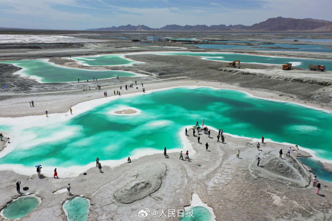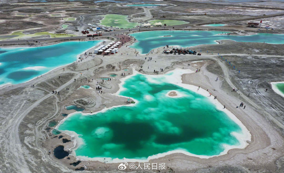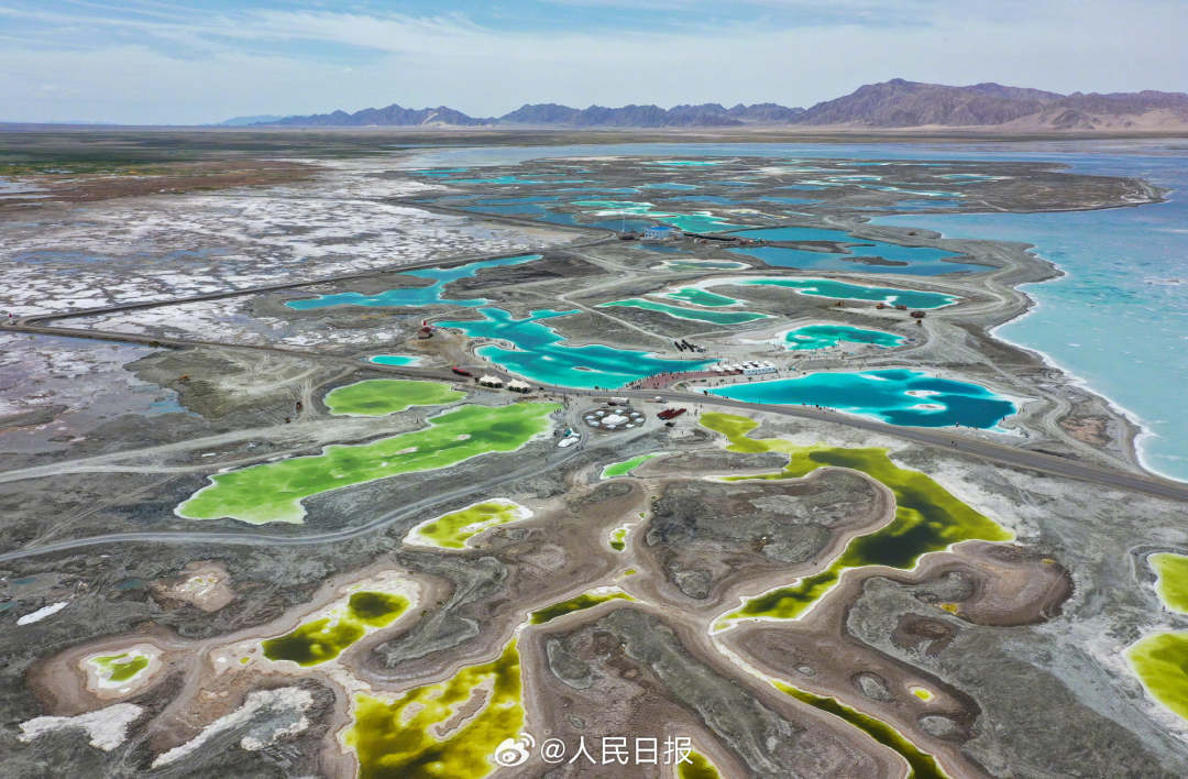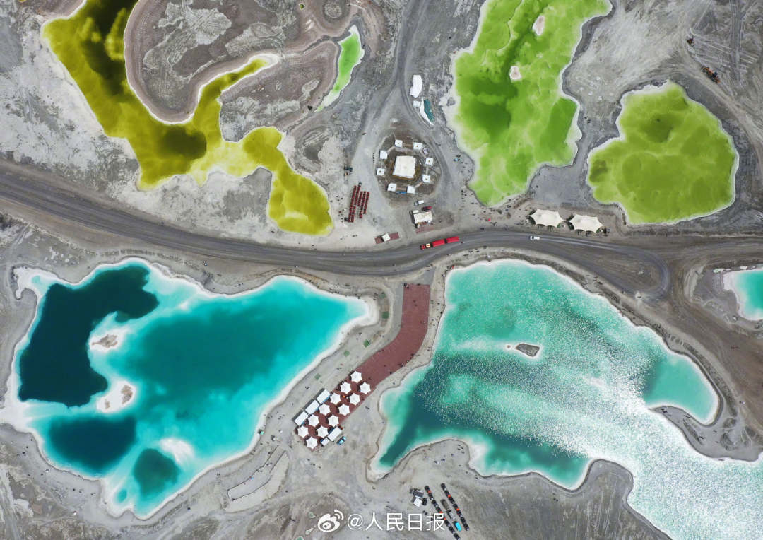 6月26日,青海海西州,大柴旦翡翠湖斑斓景色让人陶醉。翡翠湖是高海拔盐湖,盐池内或淡青、或翠绿、或湛蓝等色彩的湖水交相辉映,晶莹剔透,宛如一块块“翡翠”镶嵌在大地上。