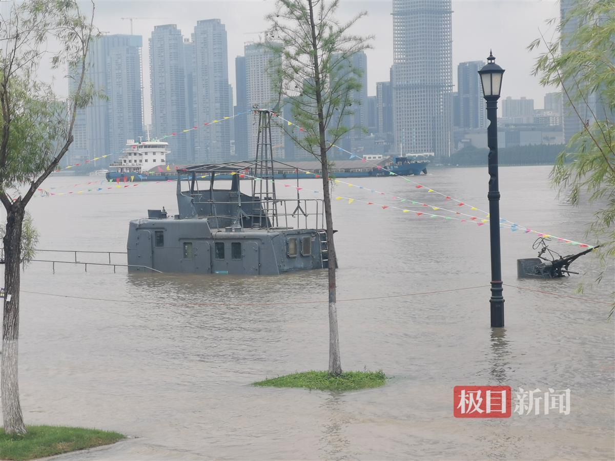 27日上午10时许,极目新闻记者来到汉口江滩,此时天空阴沉,不时飘落雨滴。极目新闻记者看到,汉口江滩分为3级大平台,海拔最低的25米平台已浅浅地没入江水中,28米平台未受影响。