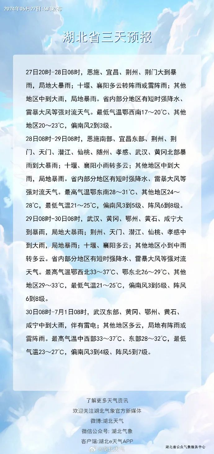 另从武汉市气象局获悉,27日晚至29日,全市将迎来新一轮大到暴雨天气过程,并伴有短时强降水、雷暴大风等强对流天气,预计此次过程累计雨量80mm~150mm,局地可达250mm以上,最大小时雨强50mm~80mm,雷雨时最大阵风风速达8~11级。预计28日夜间至29日白天降雨最强,外出要注意防范雷暴大风等强对流天气不利影响,防范强降雨可能引发的山洪地质灾害及城乡内涝。