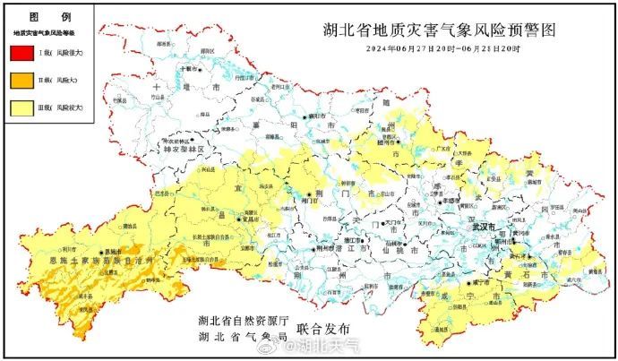 2024年6月27日20时—6月28日20时,预计三峡库区,宜昌地区、恩施地区、荆门地区、随州地区、咸宁地区、黄石地区,襄阳(保康东南部、南漳南部、宜城、枣阳南部)、荆州(松滋)、孝感(安陆、孝昌、大悟)、武汉(黄陂北部)、鄂州(鄂城区)、黄冈(红安、麻城、蕲春、武穴、黄梅)以及其他强降水区域发生崩塌、滑坡、泥石流的风险较大;其中,恩施(恩施市南部、建始南部、利川南部、咸丰、来凤、宣恩、鹤峰)、宜昌(五峰)发生崩塌、滑坡、泥石流的风险大。