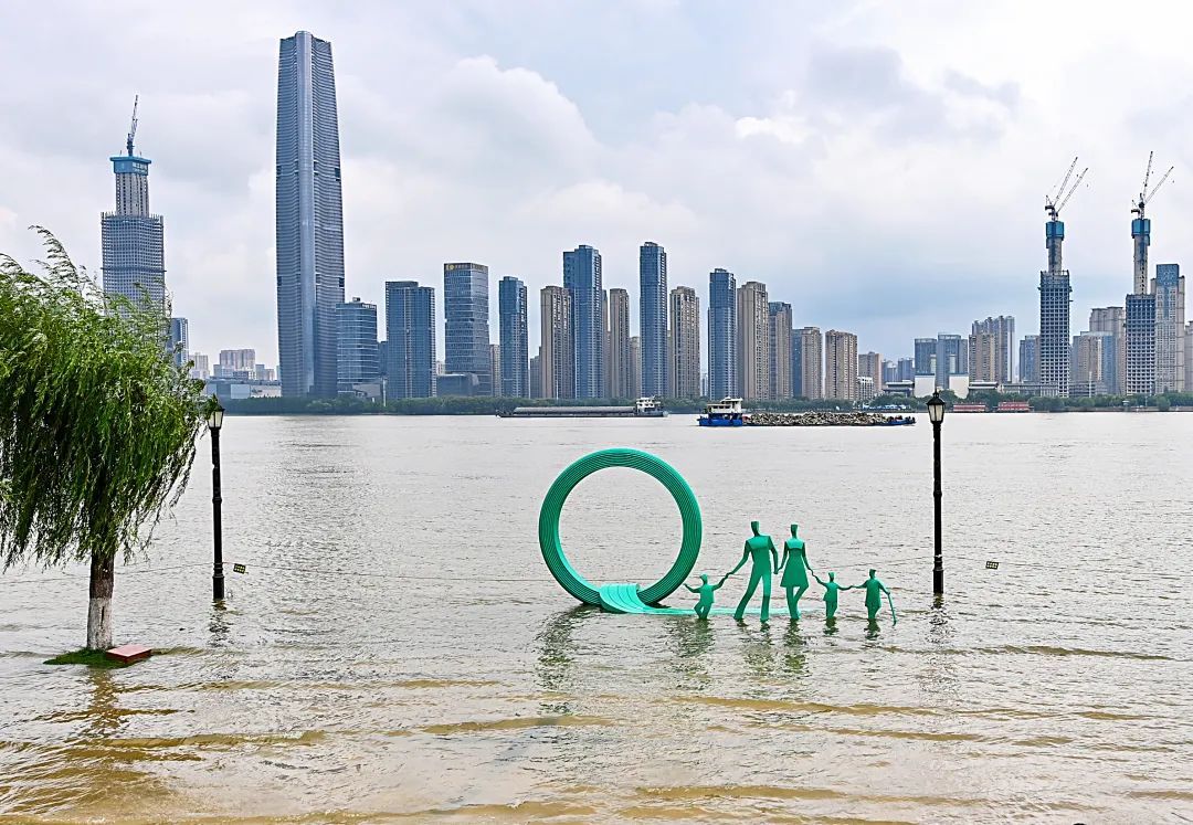 6月27日下午,武汉汉口江滩旁的“一家五口”雕像的底座已被长江水淹没。(湖北日报全媒记者 朱熙勇 摄)