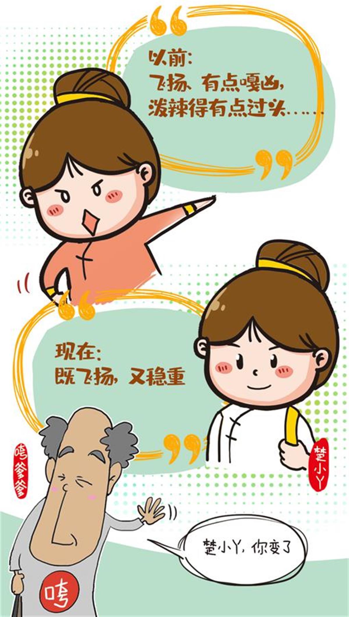 咵爹爹:你以前蛮飞扬,有时候还有点嘎凶,泼辣得有点过头。但是现在,你既飞扬,又稳重,我蛮喜欢!