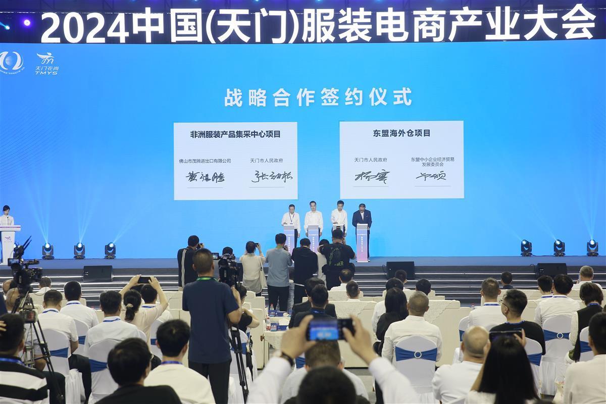 6月28日上午,2024中国(天门)服装电商产业大会项目签约仪式举行。会上,天门市人民政府与东盟中小企业经济贸易发展委员会签署战略合作协议,将在东南亚建立天门服装产业的海外仓,这一仓库建成后将直接面对海外客户端,给海外通关、市场准入、信息物流、资金流以及售后服务提供便利,让跨境电商自主权掌握在天门服装企业手中。