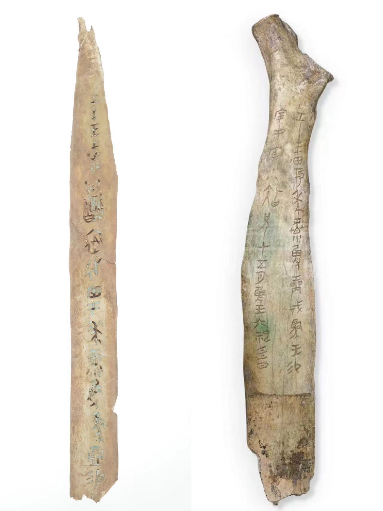 △左为嵌绿松石甲骨刻辞骨柶,2005年出土。右为宰丰骨匕,1899年左右出土。