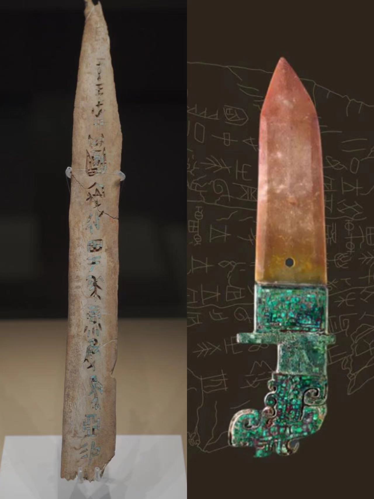 △左为嵌绿松石甲骨刻辞骨柶。右为镶嵌有绿松石的玉援铜内戈。