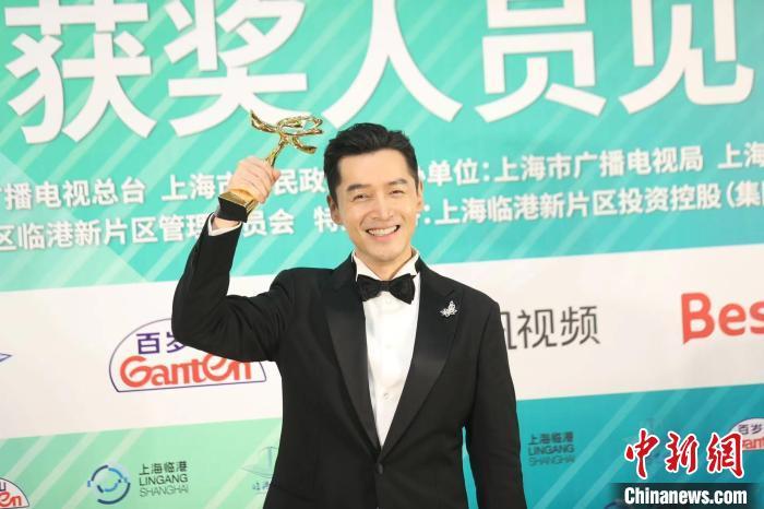6月28日晚,第29届上海电视节“白玉兰绽放”颁奖典礼在上海举行。图为胡歌举起最佳男主角奖杯。 中新社记者 张亨伟 摄